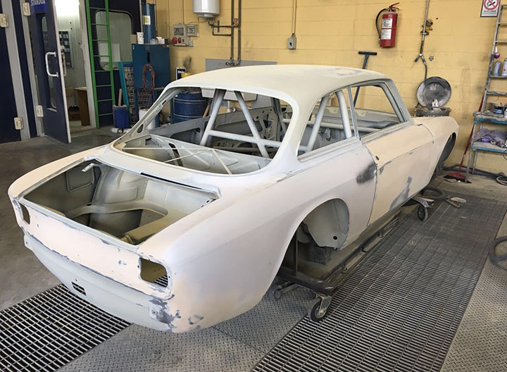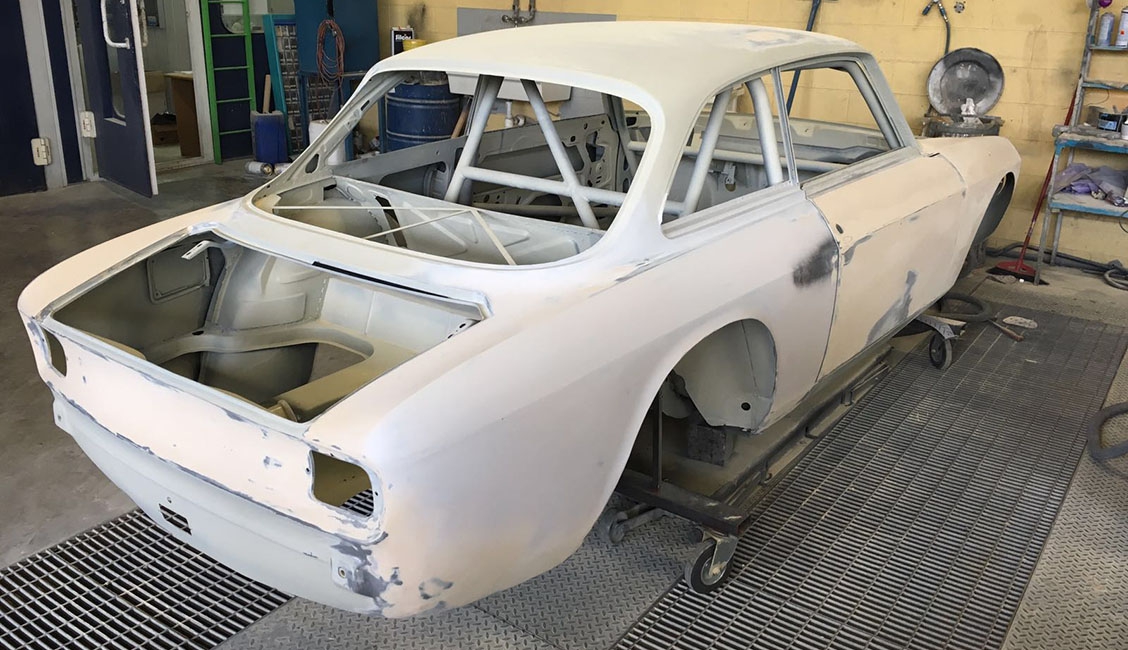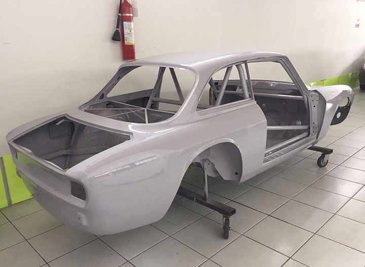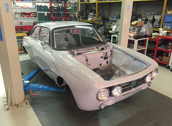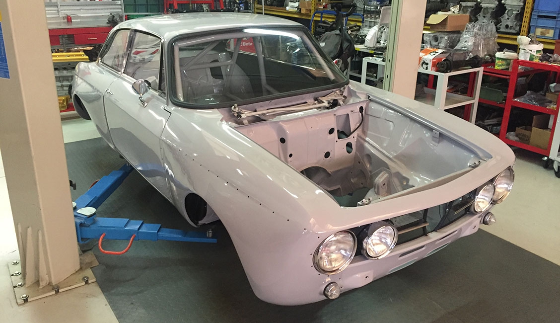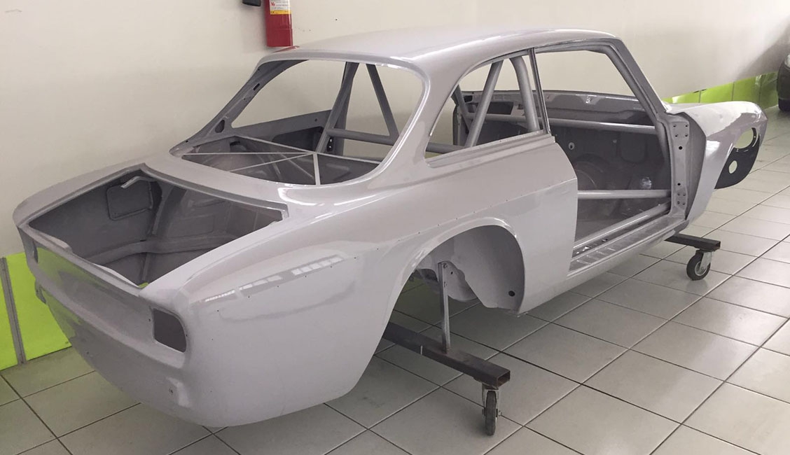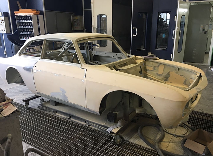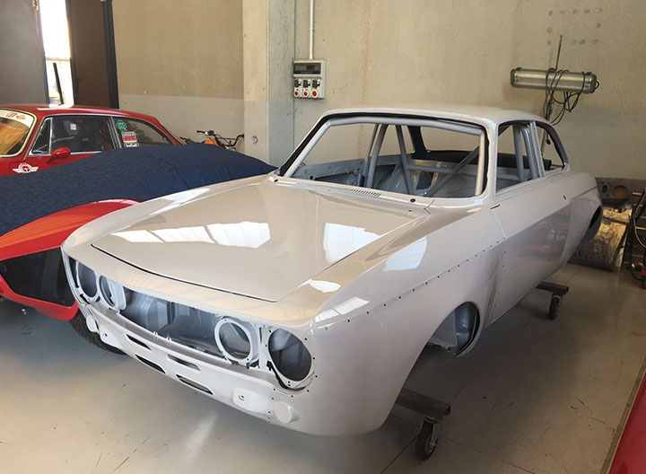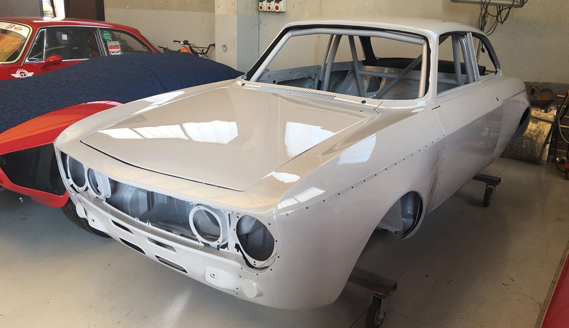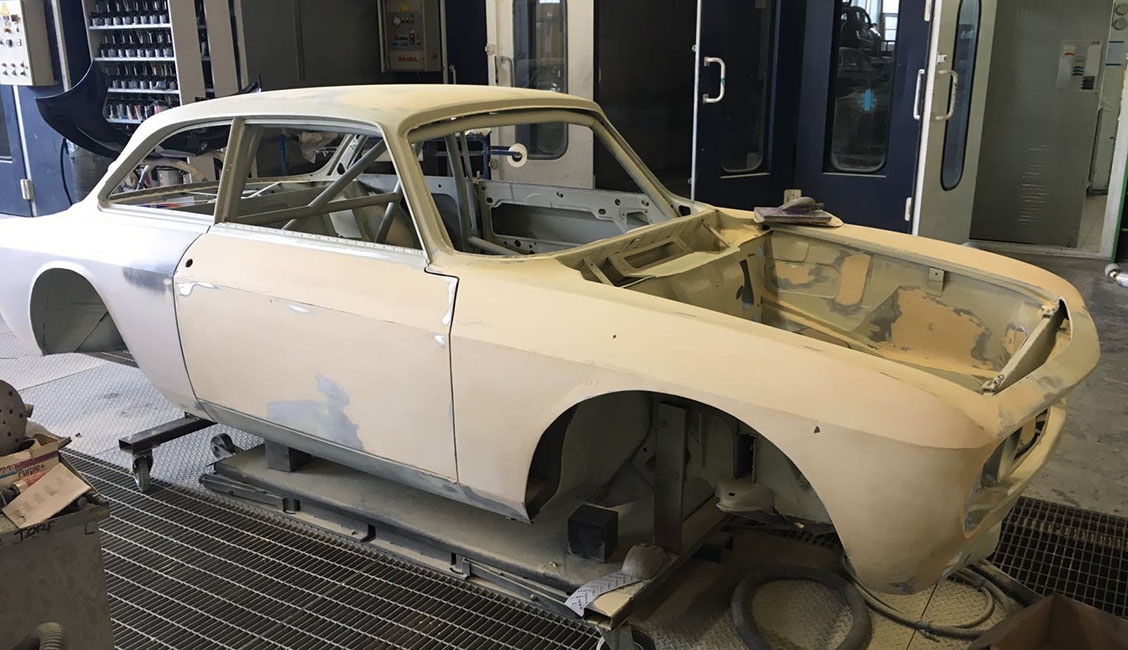 In origine la vettura era una GT 1600 preparata in versione Gr. 2 per partecipare a gare di Velocità in pista negli anni ‘70, tra le quali figura anche la 4 Ore di Monza. Successivamente era stata modificata per partecipare a gare di slalom, quindi “parcheggiata” per anni e, come spesso capita in questi casi, “cannibalizzata” di gran parte della meccanica. Tanto che quando è stata acquistata da Alfa Delta, nel 2015, alla scocca erano rimaste montate solo parte delle sospensioni. La cosa positiva è che in tutto questo lasso di tempo di inattività, la scocca è sempre rimasta parcheggiata in luogo protetto conservandosi al meglio. Anche per questo Roberto Restelli ha deciso di trasformarla in GTAm. Nonostante l’ottimo primo impatto visivo, la scocca è stata comunque sottoposta a termosverniciatura, seguita da una leggera sabbiatura per rimuovere i residui, in modo tale da poter arrivare alla lamiera viva e verificare con certezza lo stato di salute dei lamierati, risultati effettivamente in ottime condizioni.