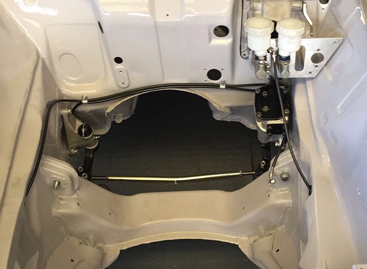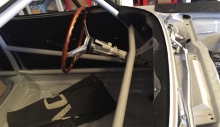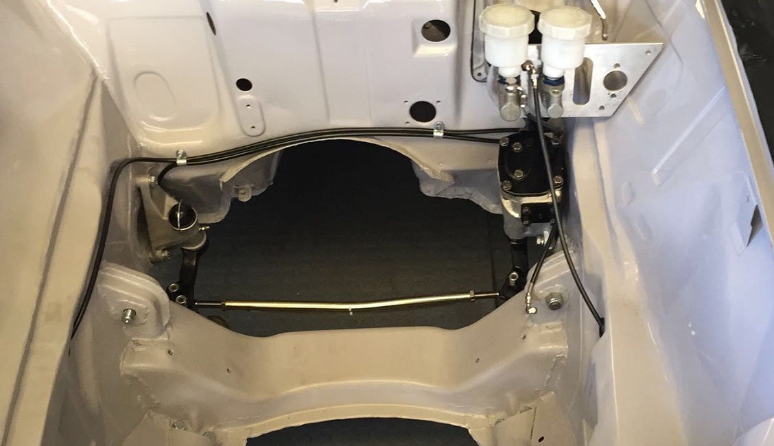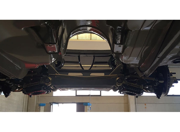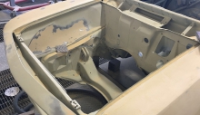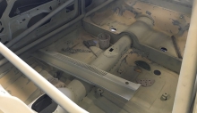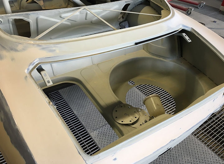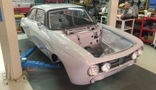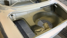 Come ulteriore verifica sono stati staccati i fascioni sottoporta, uno dei punti “sensibili” all’interno dei quali spesso parte il processo di corrosione favorito da residui di umidità, sostituiti con particolari nuovi. Ricevuta la conferma che anche nelle parti più “intime” la scocca si era mantenuta sana, la stessa è stata montata su banco dima per procedere ai lavori di lattoneria, sia per quanto riguarda l’irrigidimento di tutto l’insieme sia per l’adeguamento alle nuove forme. Oltre alla risaldatura tra l’accoppiamento dei lamierati, sono stati aggiunti rinforzi nelle parti più sollecitate, tra cui gli attacchi della scatola dello sterzo, delle sospensioni e del ponte posteriore, quindi eseguite le modifiche all’interno del vano motore e bagagli, oltre a tagliare i parafanghi per applicare quelli maggiorati in vetroresina.