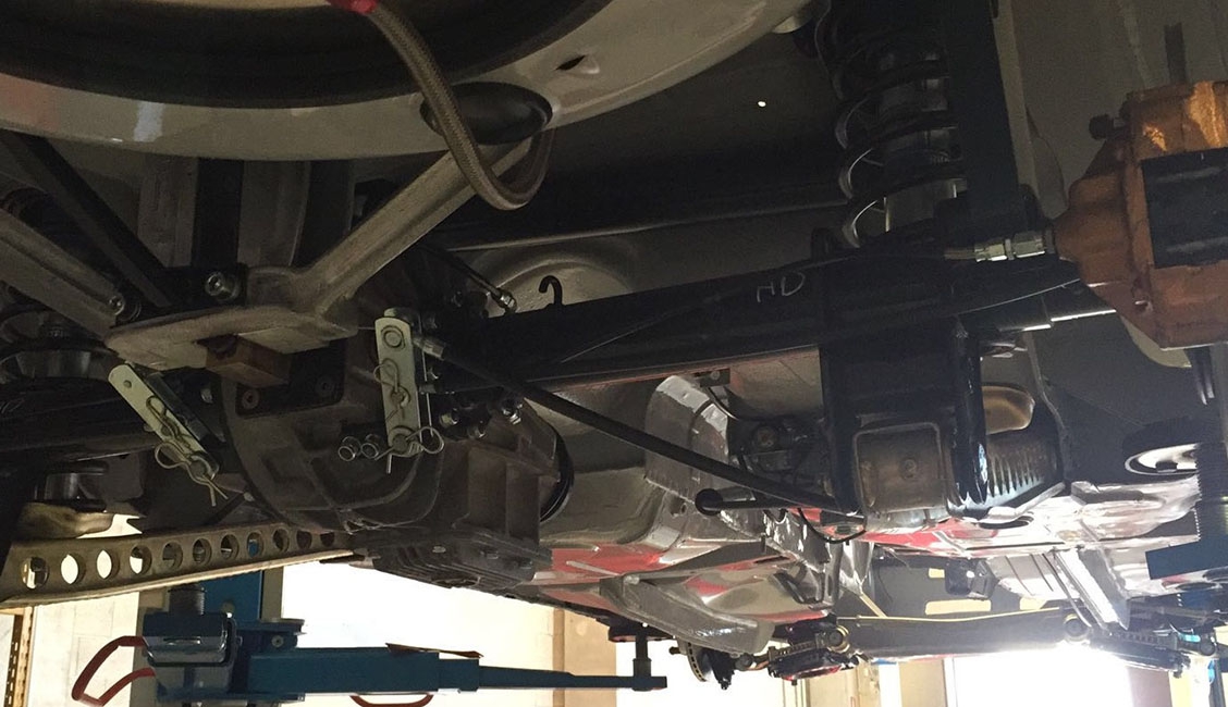 Il corpo centrale della scatola guida è stato realizzato dal pieno, dato che quello originale in alluminio è soggetto a rotture per l’eccessivo sforzo, mentre il meccanismo interno rimane originale. Il braccio di rinvio centrale dello sterzo è stato realizzato ex novo e piegato, così come i tiranti laterali sono stati realizzati ex novo dal pieno con sezione esagonale per velocizzare le operazioni di regolazione, così come sono state modificate le leve dello sterzo per evitare il contatto con la parte interna dei cerchi ruota, da 9J x 13” con pneumatici Michelin.