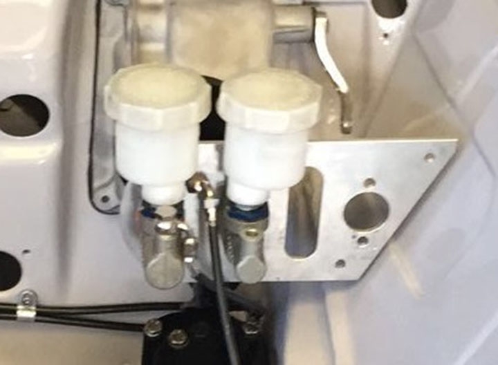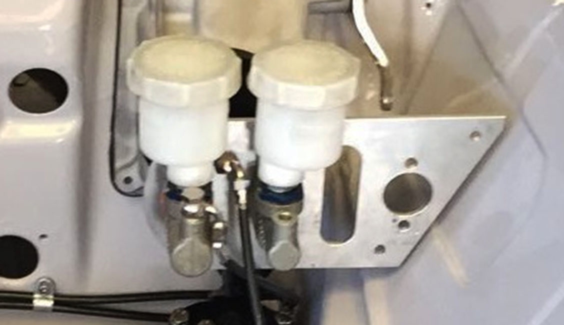 L’impianto frenante è stato realizzato per ottenere le massime performance e funzionalità in funzione di quanto concesso dal regolamento. Dato che la vettura ha una pedaliera con ancoraggio dei pedali in alto, nella parte superiore sinistra del vano motore è stato applicato un castelletto che ospita le doppie pompe AP Racing, in luogo della pompa singola e servofreno, con possibilità di regolazione della ripartizione della forza frenante sui due assi tramite registro posto sul bilanciere che collega i due puntali di azionamento.