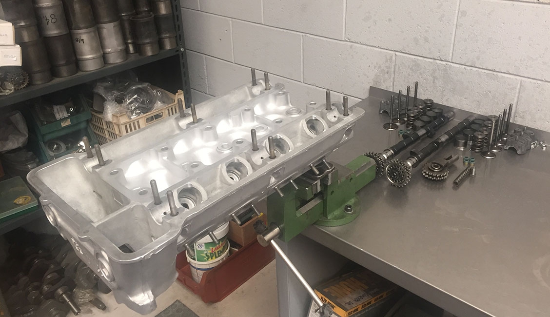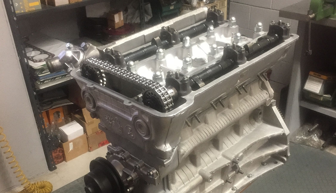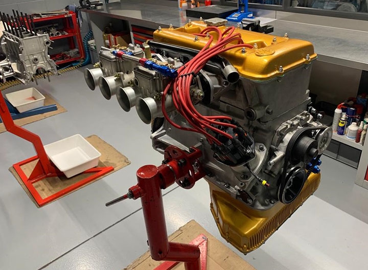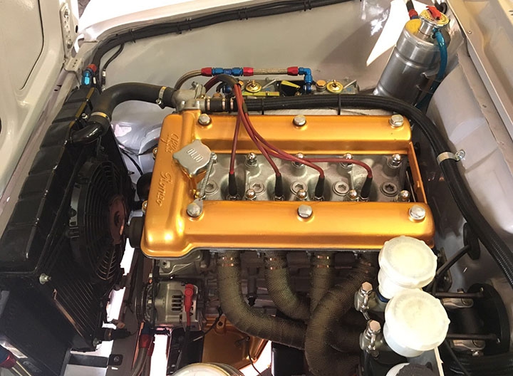 La versione “testa stretta” mantiene tutta la parte inferiore uguale al motore tradizionale fino alle bielle, mentre cambiano i pistoni, soprattutto nel profilo del cielo dato che la testa stretta ha una camera di scoppio dal disegno più piatto, e la pompa dell’olio perché aziona anche lo spinterogeno a doppia accensione, simile a quello della GTA ma ovviamente con specifiche di anticipo differenti e sensori in luogo delle puntine. Oltre al differente angolo delle valvole, 90° anziché 120°, queste hanno anche un diametro del fungo differente per quanto riguarda lo scarico, mentre rimane invariato (46,5 mm) all’aspirazione. Dopo i primi esemplari di motori “testa stretta” dotati di carburatori DCOE da 45 si è passati a quelli da 48, realizzando appositi supporti ricavati dal pieno, così come sono stati realizzati appositi collettori in acciaio inox. A seguito di questo ulteriore sviluppo c’è stato il vero salto in avanti, arrivando ad una potenza massima di 217 CV a 7.400 giri/min ma soprattutto ad una più corposa erogazione della coppia con un picco di 239 Nm a 6.000 giri/min. Per contro, la versione “testa stretta” richiede una maggiore frequenza di revisione, perché date le caratteristiche base del motore Alfa Romeo, corsa lunga (88,5 mm), al massimo regime di giri il pistone ha una velocità media elevata.