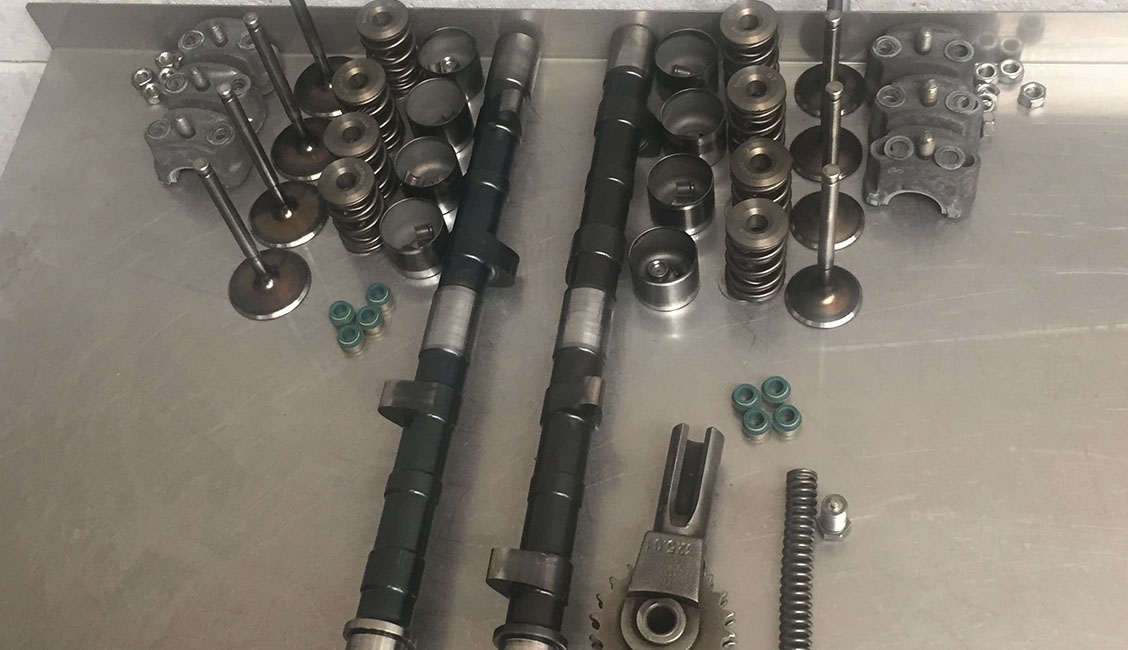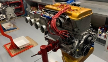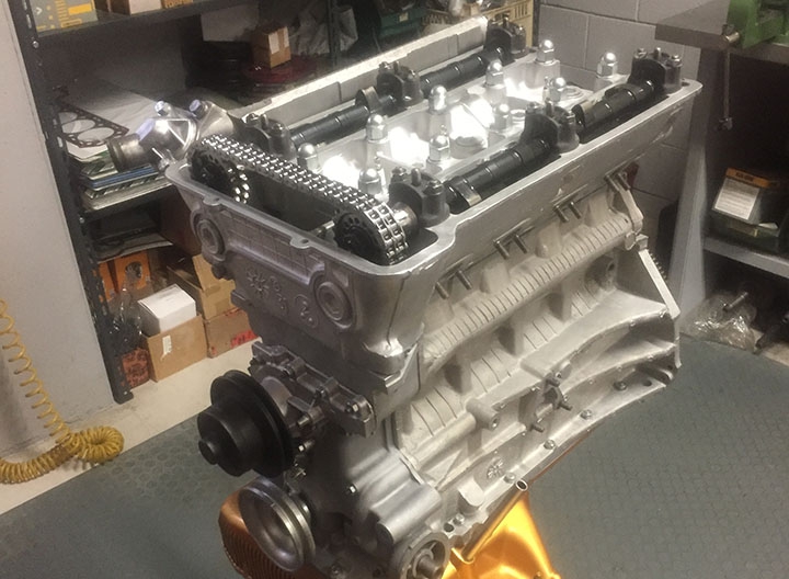 Per la preparazione del motore si è partiti dal tradizionale basamento motore 2.0 litri, la cui omologazione, da alcuni anni a questa parte, ha evitato di dover utilizzare il basamento 1750 che comportava una serie di problematiche: dato l’interasse tra i cilindri limitato, per aumentare l’alesaggio (da 80 a 84,5 mm), così da ottenere la cilindrata 2.0 litri, si ricorreva al cosiddetto “salamino” o “monocanna”, una fusione solidale delle quattro canne che veniva inserita nel monoblocco originale. Tale soluzione, però, oltre al costo elevato non garantiva la massima affidabilità, perché il monoblocco lavorato per ospitare la fusione perdeva in rigidità causando in alcuni casi il movimento della fusione stessa che poteva accusare rotture oppure causare frequenti bruciature della guarnizione della testata. Il motore 2.0 litri originale è stato completamente smontato e inviato in rettifica per i classici lavori di ripristino piani, barenatura, bilanciatura albero motore con volano, alleggerito in acciaio e blocco frizione con piatto in alluminio e monodisco sinterizzato, e verifica passaggi olio e liquido di raffreddamento. Quindi sono stati sostituiti i prigionieri e montate bielle Arrow, con disegno originale, e pistoni stampati realizzati su disegno Alfa Delta. Per ottimizzare la lubrificazione è stata montata una pompa olio con ingranaggi maggiorati e inserita una piastra antisciacquo tra la coppa e sottocoppa, in alluminio, e il monoblocco. La puleggia anteriore dei servizi è stata realizzata in Ergal dal pieno. Sulla testata si è lavorato per ottimizzare i condotti di aspirazione scarico, eliminando imperfezioni e scalini, e la conformazione delle camere di scoppio. Le valvole originali sono state sostituite da altre in acciaio mnimonic, materiale che ha consentito la diminuzione del diametro dello stelo da 9 a 8 mm, abbinate a molle specifiche, piattello superiore in Ergal e bicchierini Arrow rinforzati. Il diametro del fungo valvola è stato maggiorato per quelle di aspirazione e ridotto per quelle di scarico. Su indicazione Alfa Delta sono stati realizzati specifici alberi a camme più spinti, con alzata maggiorata, ottimizzando la distribuzione con ingranaggi alleggeriti sottoposti a trattamento antiattrito così come la catena.