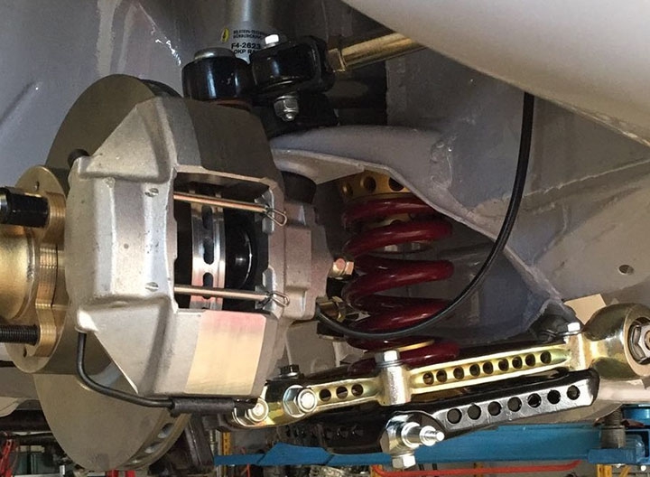 Le sospensioni mantengono schema e punti di attacco come in origine, pur con diverse modifiche per diminuire il peso e aumentare la funzionalità. I trapezi anteriori, originali così come le boccole di ancoraggio, sono stati alleggeriti tramite fori e poi verniciati a polvere o zincati. I bracci superiori sono stati modificati per consentire la regolazione della campanatura, mentre i bracci di regolazione dell’incidenza rimangono originali. La barra antirollio maggiorata, disponibile con tre differenti tipi di carico da poter scegliere in base alla pista, è collegata al trapezio tramite uniball. I mozzi anteriori, che alloggiano cuscinetti SKF, sono stati realizzati ex novo in Ergal. Gli ammortizzatori sono Bilstein, realizzati in esclusiva da NTP Italia per OKP con tarature specifiche, accoppiati a molle Eibach, del diametro di 60 mm, con adattatori in Ergal di fissaggio al piattello originale.