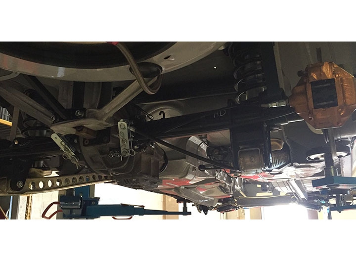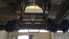Al posteriore rimane lo schema a ponte rigido ma con alcune sostanziali modifiche. Innanzitutto sulla parte posteriore della scatola differenziale è stata fissata una piastra che integra il perno di scorrimento nella guida dello “slittone”. I puntoni longitudinali sono stati alleggeriti, tramite fori, e risaldati per aumentare la rigidità, inoltre l’ancoraggio ora avviene tramite uniball. Nella parte inferiore della scocca sono stati saldati due punti di attacco per la barra antirollio, collegata ai puntoni tramite biellette e uniball. Al posteriore le molle piccole Eibach, da 70 mm di diametro, sono coassiali agli ammortizzatori Bilstein realizzati in esclusiva da NTP Italia per OKP. Anche al posteriore i cerchi sono da 9Jx13”.