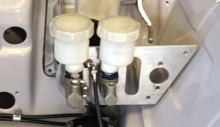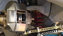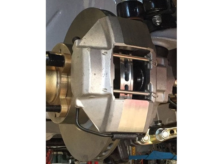 Inoltre c’è un regolatore della forza frenante al posteriore per evitare eventuali bloccaggi. Il castelletto è stato appositamente realizzato per ospitare la pompa frizione, anch’essa AP Racing ma con specifiche differenti. Le pinze anteriori Ate (tipo Porsche 911S) sono state modificate, realizzando appositi pistoncini in Ergal con distanziale in ceramica per non trasmettere il calore all’olio, così da poter utilizzare pastiglie freno Pagid di maggiore spessore. Inoltre, dato che per regolamento il disco freno autoventilato (da 22x 250 mm) e la campana devono essere un pezzo unico, è stato fatto un accurato lavoro di centratura del fissaggio della pinza sul fusello, in modo tale che la stessa operi in perfetto accoppiamento con il disco. Infine sono state montate colonnette di ultima generazione, alleggerite e con dadi di fissaggio in Ergal. Al posteriore disco e pinza freno rimangono originali.