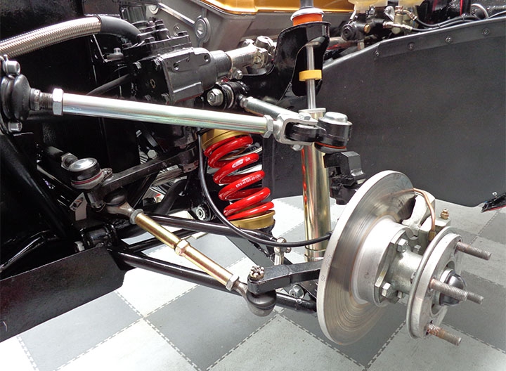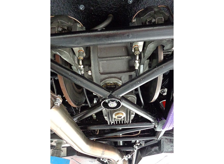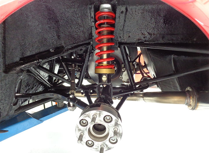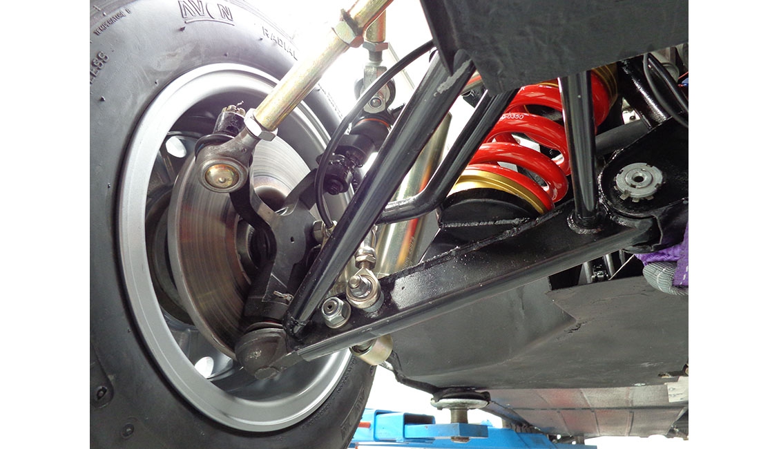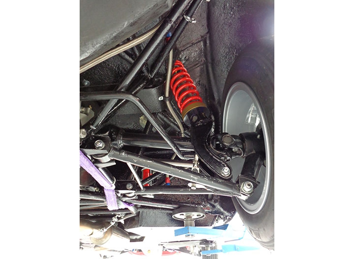 Per quanto riguarda le sospensioni, sono stati mantenuti i triangoli inferiori, sostituendo boccole e uniball al posteriore, e fuselli, mentre sono stati realizzati ex novo, dal pieno, i tiranti superiori: all’anteriore braccio oscillante, ora regolabile per consentire la variazione dell’angolo di camber, puntone e braccetto dello sterzo, entrambi regolabili rispettivamente per incidenza e convergenza, mentre al posteriore il braccetto di regolazione della convergenza.