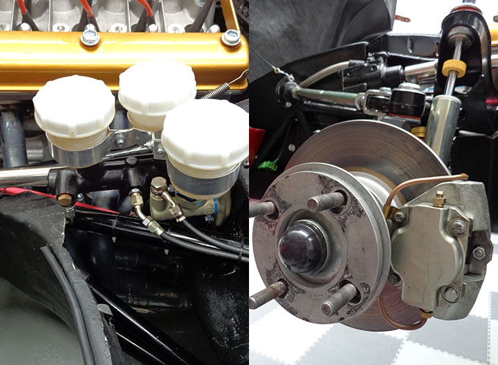 La pompa freno singola e le pinze freno Girling a due pompanti, smontabili, uguali sia all’anteriore che al posteriore, sono state revisionate, mentre sono state sostituite le tubazioni ad alta resistenza a treccia metallica e i dischi freno: da 267 x 9,5 mm al posteriore, posizionati entrobordo ai lati del differenziale, e da 250 mm all’anteriore per poter essere alloggiati all’interno dei cerchi da 13”. Inoltre è stato montato un limitatore della forza frenante al posteriore, anche se quasi superfluo dato l’ottimo bilanciamento dei pesi tra gli assi anteriore e posteriore della vettura: 57% all’anteriore e 43% al posteriore, grazie al motore montato in posizione arretrata e abbassata, posizione di guida arretrata, differenziale posteriore proteso verso l’anteriore e passo corto della vettura.