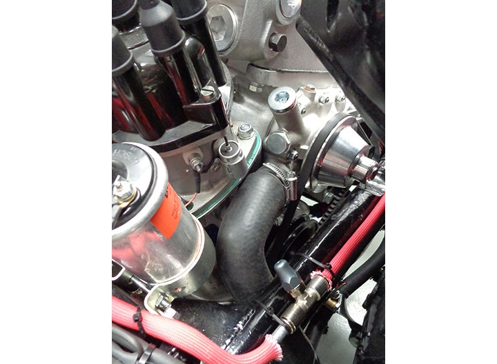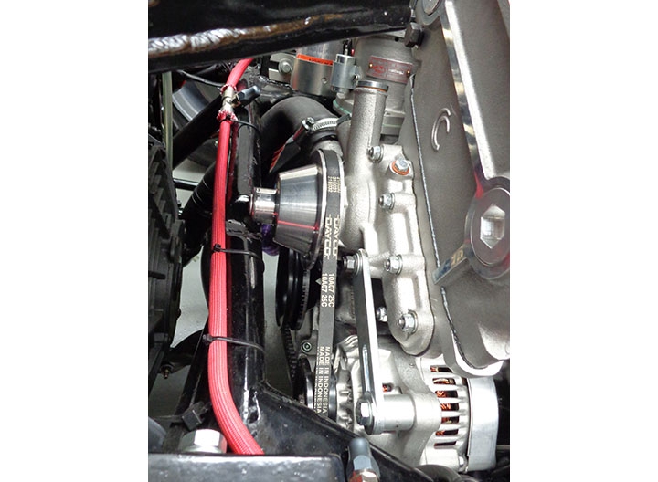 Anche la pompa dell’acqua ha richiesto particolari modifiche: partendo da quella della versione “America”, è stata realizzata una particolare puleggia in Ergal, ricavata dal pieno, sagomata in modo tale da poter garantire l’alloggiamento del dado centrale di fissaggio nell’apposito incavo ricavato sulla traversa del telaio.