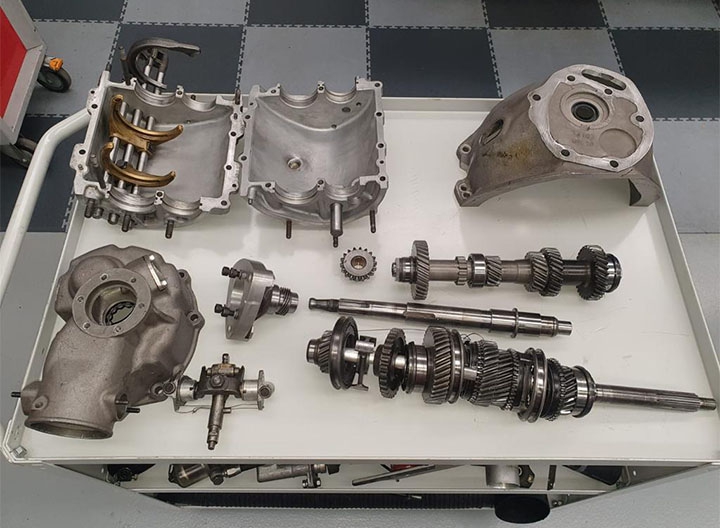 Per quanto riguarda la trasmissione, data la particolarità delle componenti, è stata eseguita una revisione completa delle stesse oltre ad un adeguamento della rapportatura in funzione delle caratteristiche dei principali circuiti nazionali sui quali potrà essere utilizzata la vettura. Il cambio utilizza la scatola centrale con ingranaggeria di provenienza Giulia, mentre la campana è di tipo specifico per consentire l’accoppiamento con il motore inclinato, così come la culatta, con la torretta di innesto della leva cambio, che ha supporti differenti. La meccanica del cambio è stata completamente revisionata con la sostituzione di ingranaggi, selettori, scorrevoli e cuscinetti, mentre la scalatura dei rapporti, di tipo MA, è stata variata con la sostituzione di una 5^ marcia più lunga.