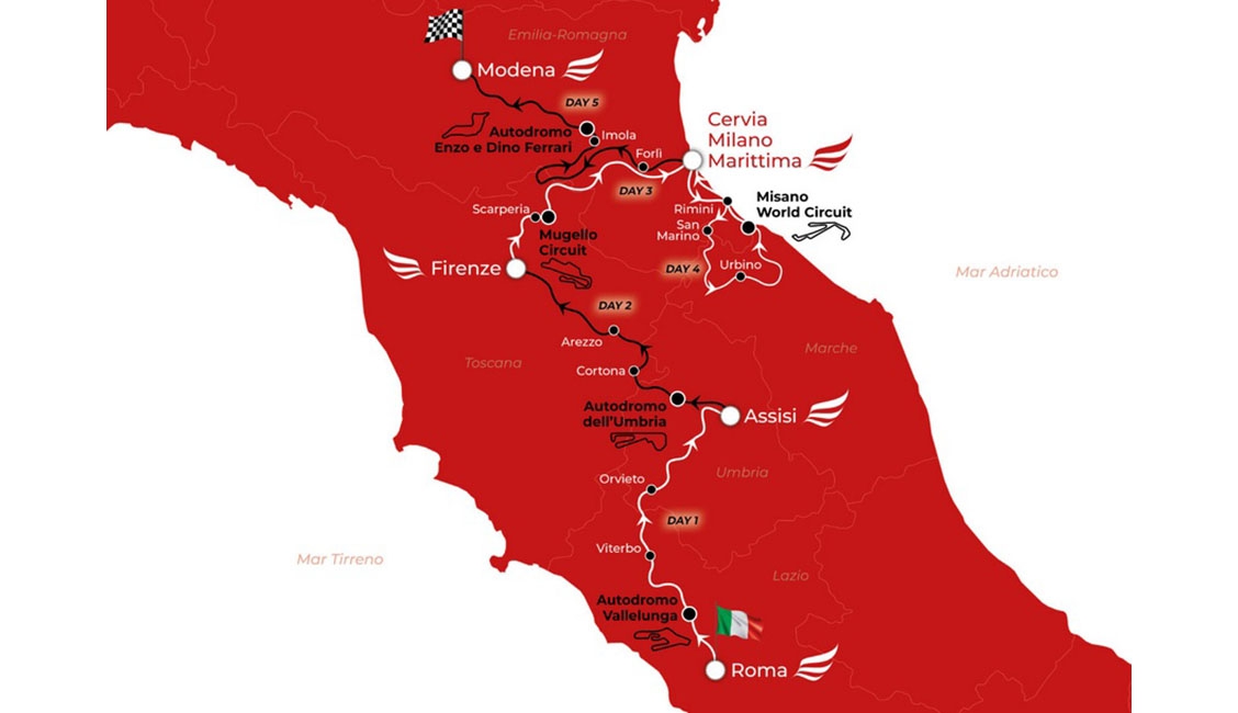 Questi, in sintesi, i percorsi e le tappe: da Vallelunga verso Viterbo e Orvieto fino all’arrivo di tappa alla mistica e suggestiva Assisi. Il 7, dopo le gare a Magione, passaggio a Cortona, l’antica città etrusca, Arezzo, terra di Piero della Francesca, fino a Firenze. Qui il venticinquennale verrà celebrato con la cena di gala nel Salone dei Cinquecento di Palazzo Vecchio, uno degli appuntamenti più attesi del programma. Mercoledì 8 la sfida è su una delle piste più impegnative, il Mugello, coi suoi saliscendi, per poi puntare sulla Riviera romagnola con la sosta per due notti a Cervia-Milano Marittima. Giovedì 9, attraversando Rimini, città di Fellini, la Repubblica di San Marino e Urbino, i concorrenti arriveranno al Misano World Circuit per la penultima gara in pista prima del rientro a Cervia. Venerdì 10, tappa conclusiva con destinazione Imola, passando per Forlì. All’Autodromo Enzo e Dino Ferrari, l’ultima e decisiva sfida dopo una sessione di prove libere e schieramento secondo classifica raggiunta nei primi quattro giorni. Poi, a classifica finale ormai definita, il tradizionale arrivo a Modena, capitale della Motor Valley, al cospetto dell’Accademia Militare, dove si svolgerà la premiazione.