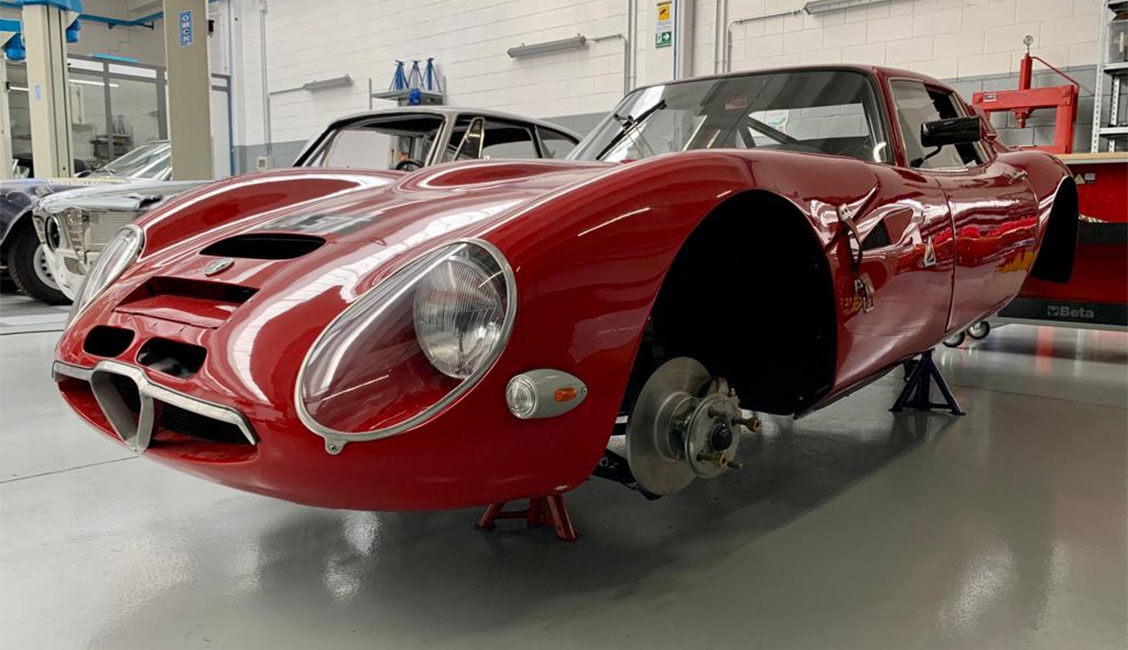 Dopo la revisione completa di telaio, carrozzeria e parte meccanica, presso l’officina Alfa Delta di Marnate è quasi ultimato l’assemblaggio della spettacolare Giulia TZ 2. La carrozzeria è stata completata con il montaggio delle superfici vetrate e relative guarnizioni nuove, di mascherine, fregi e le affascinanti cinghiette di fissaggio. L’impianto elettrico è stato realizzato ex novo, mentre la strumentazione è stata rigenerata. Nei giorni scorsi il proprietario della vettura ha provato il posto guida che, dati gli spazi piuttosto sacrificati, ha richiesto un adattamento della pannellatura interna del pavimento per ottenere il migliore posizionamento del sedile. Dopo la verifica al banco prova è stato montato il gruppo motore cambio e tutta la parte meccanica. Il tocco finale, prima del collaudo su strada, riguarderà l’assetto. Allo scopo, nei prossimi giorni il responsabile di un’azienda costruttrice di ammortizzatori farà visita nell’officina varesina per definire con Roberto Restelli la realizzazione di ammortizzatori con caratteristiche specifiche.
